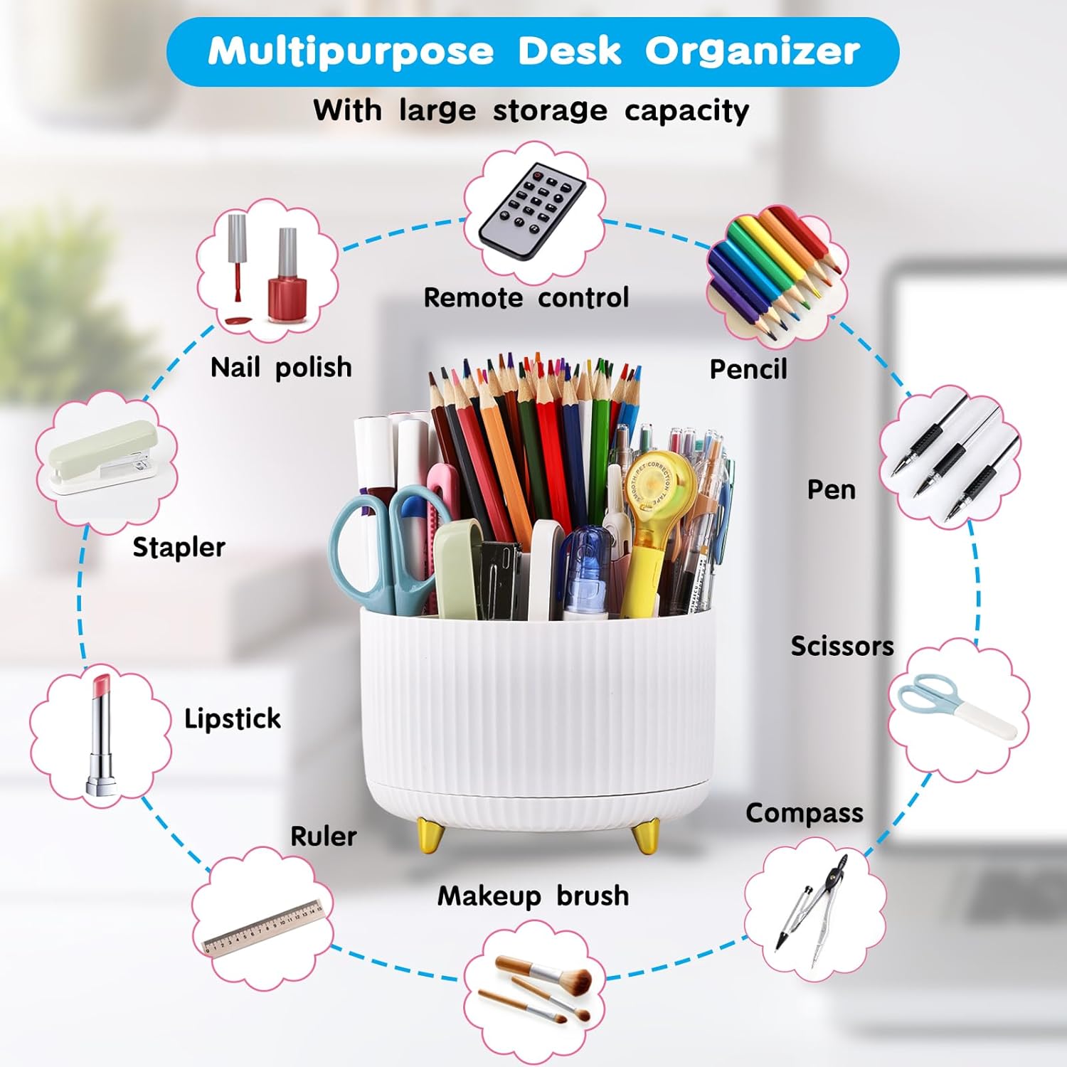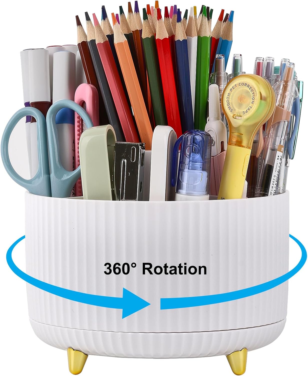XHEHOY Pencil Pen Holder for Desk, 360 Degree Rotating Desk Organizers with 5 Slots, Cute Pen Cup for Office, School, Home and Art Supply, Desktop Storage Stationery Supplies Organizer, White
